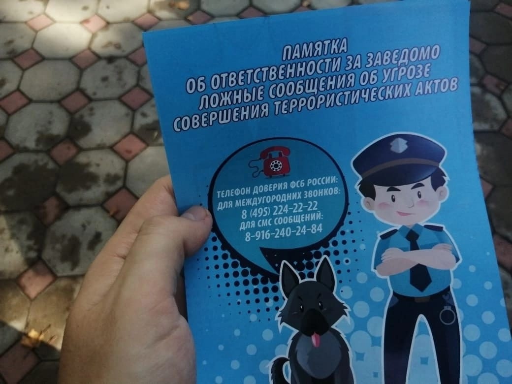 Жители города получили тематические информационные памятки об ответственности за заведомо ложные сообщения об угрозе совершения террористических актов, разработанные Краевым молодёжным центром развития личности.
